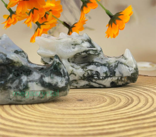 Natural Moss Agate Dragon Head Healing Crystal Carving Crafts